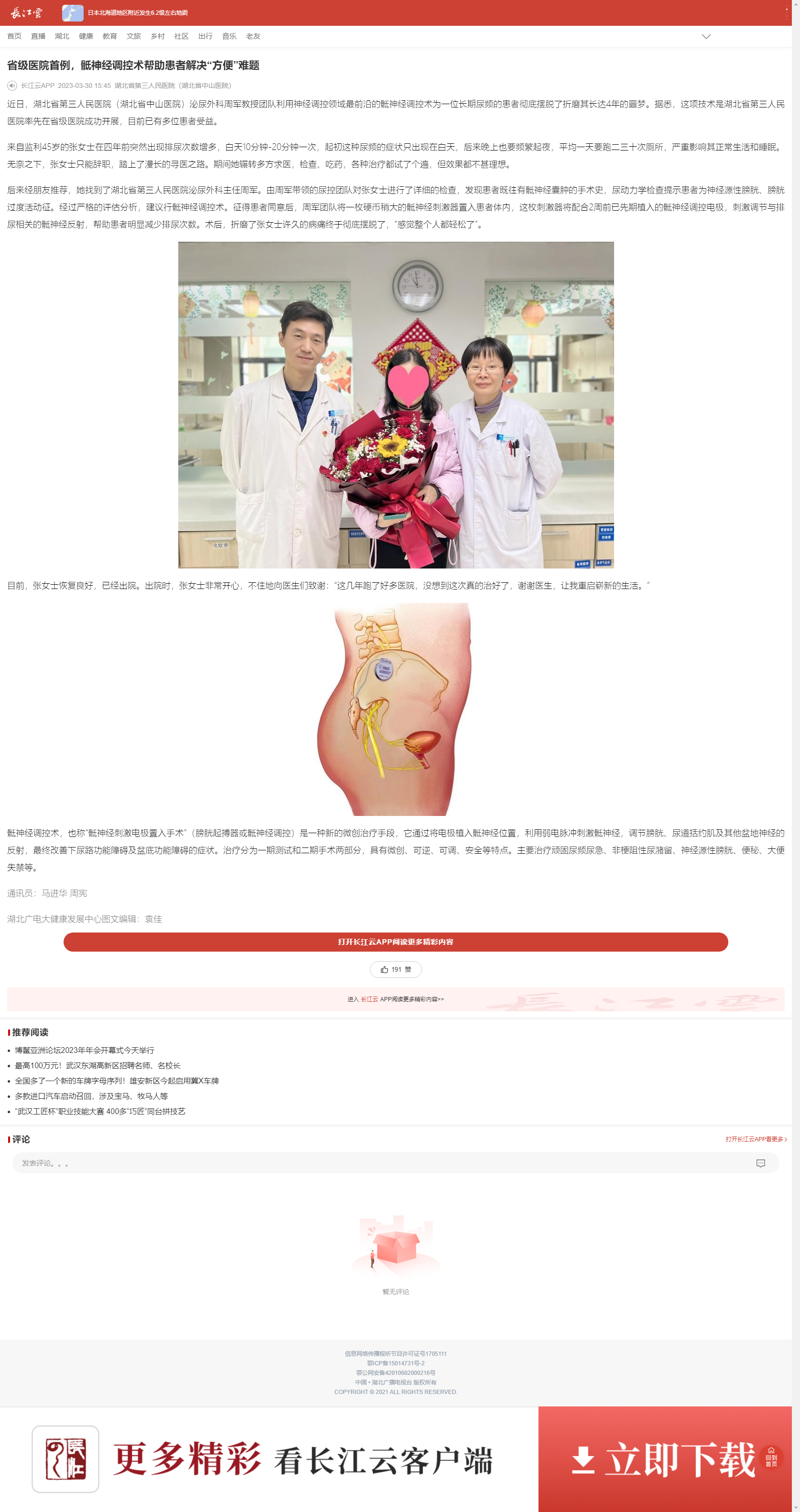 【长江云】省级91porn 首例,骶神经调控术帮助患者解决“方便”难题 发布时间:2023-05-04 来源:长江云 上一篇:【荆楚网】从“无”到“有”,甲乳外科助乳腺癌患者 重拾健康和美丽 下一篇:【荆楚网】微创介入堵大血管破口,多科协作显省三医实力