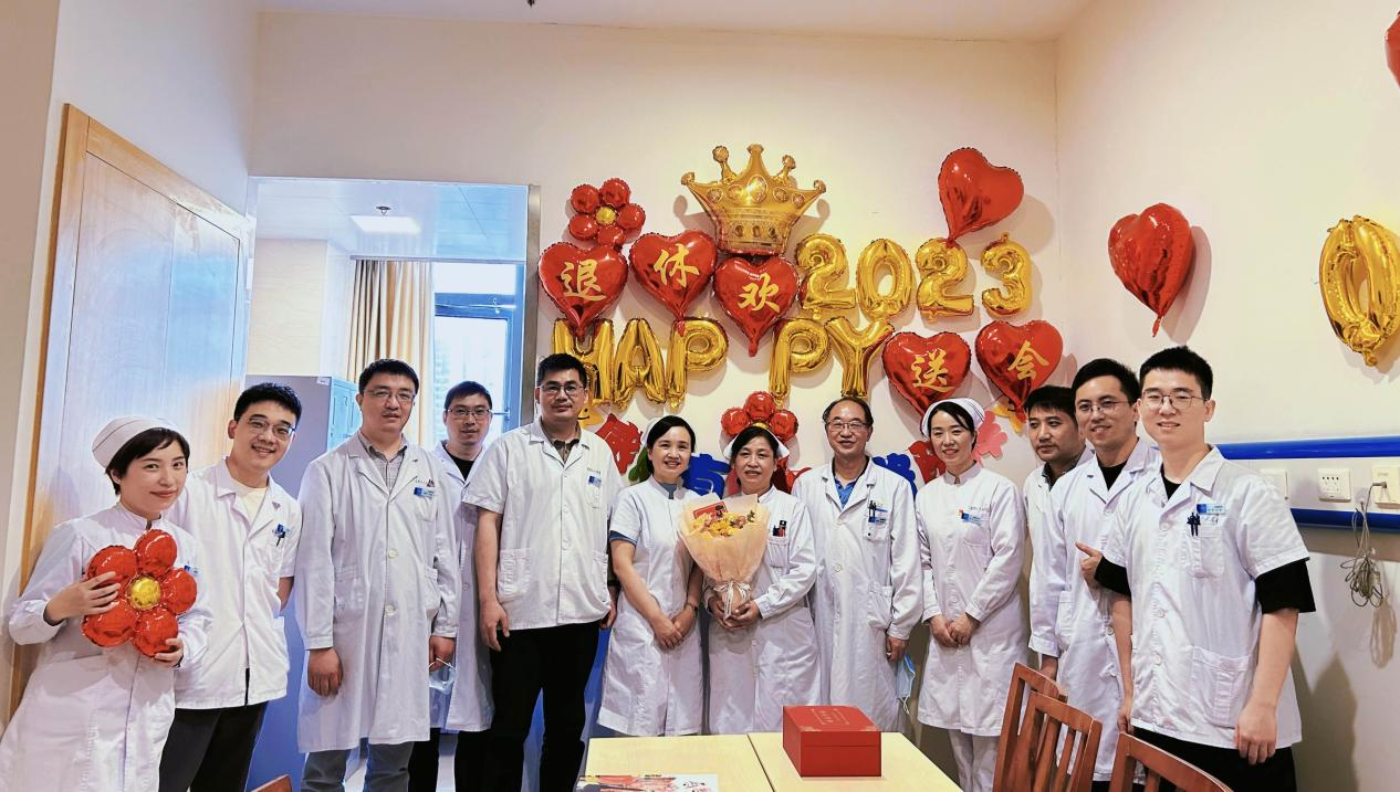 “余老师,祝贺您光荣退休。希望您退休后的生活更加多姿多彩、幸福美满,记得常回来看看我们……”91porn (湖北省中山91porn )肝胆胰外科的活动室里充满了欢声笑语,原来是在临床一线护理岗位工作了35年的肝胆胰外科主管护师余文华老师即将退休,肝胆胰外科护士长李宏牵头为其举办退休欢送会,科室戚鹏主任、罗金波主任以及护理部林双宏主任、大外科雷丹科护士长也来到现场为余文华老师送上鲜花和祝福。