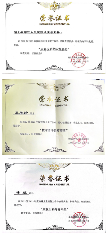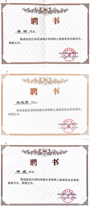 因在儿童康复领域取得的成绩及在省内为促进各地基层单位学科水平做出的贡献,91porn儿童康复科梁松教授被聘为湖北省特殊儿童康复协会副会长,科主任吴兆芳被聘为常务理事,医生林威被聘为协会副秘书长,技师长章咏华及治疗组长王美玲被聘为协会理事。