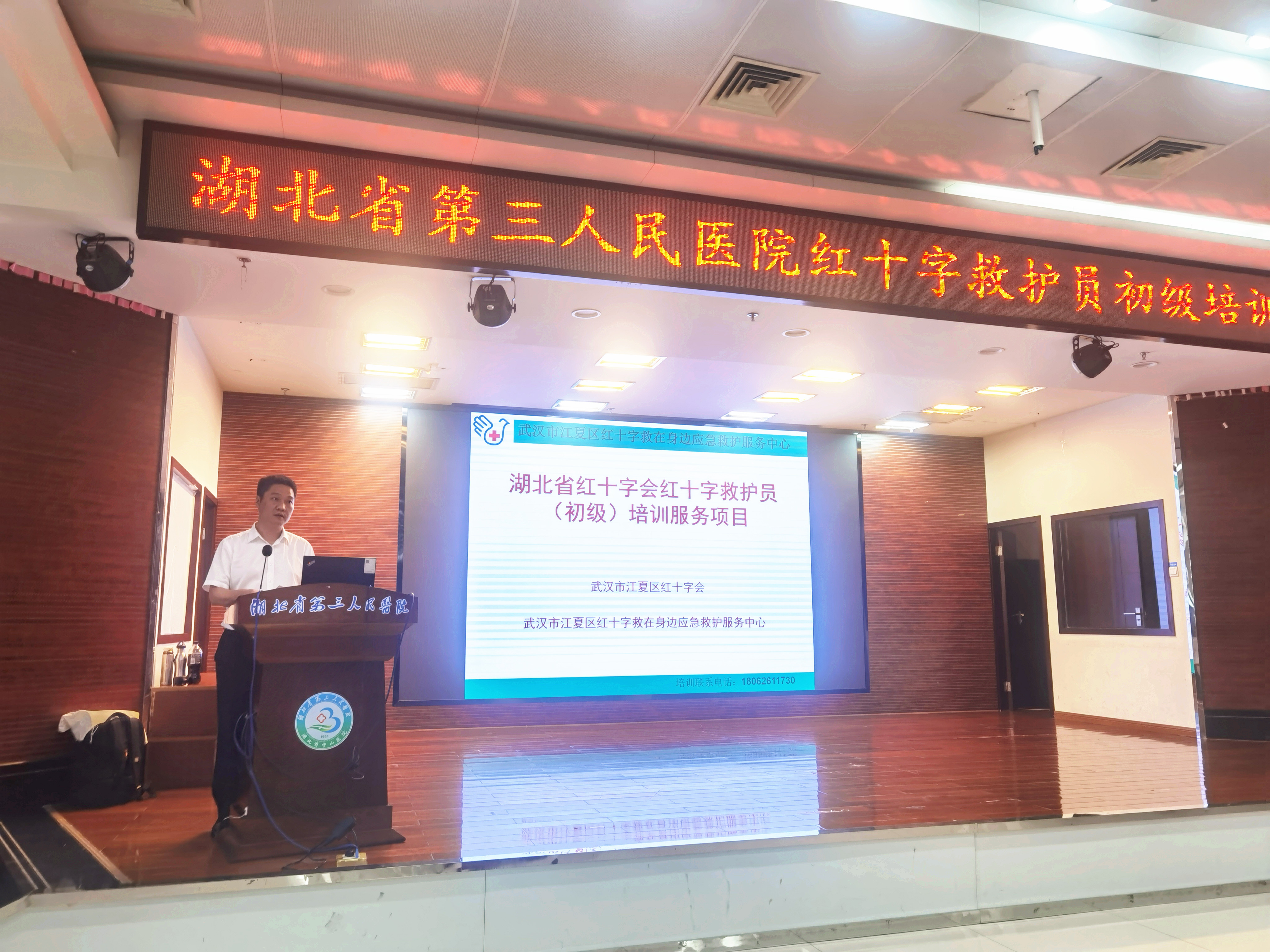 7月14日,91porn (湖北省中山医院)联合湖北省红十字会、武汉市硚口区红十字会,邀请江夏区红十字“救在身边”应急救护服务中心,为全院行政后勤职能部门人员开展了一堂生动的应急救护培训课,党委书记朱海东做开班讲话。