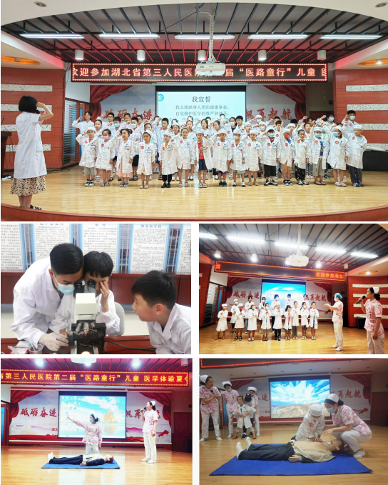 儿科团队精心设计了多个活动环节。“穿上白大褂,我是小医生”,小朋友们摇身一变,成了“小小医生”,在儿科王瑞莹医师的带领下,小朋友们宣读医师誓词,开始体验着各自的“从医之旅”。“显微镜下的神奇世界”,在检验科吴超老师的指导下,小朋友一个个兴致勃勃地观察着显微镜下的神奇世界,观看细菌的各种形态,由此让小朋友们知道细菌是肉眼不可见的,要注意卫生,饭前便后要洗手,防止病从口入。“七步洗手法”,儿科护士陶敏教授孩子们洗手的步骤,小朋友们仔细搓洗着自己的小胖手,把小手洗得干干净净。“传播急救技能”,每年的暑假都是溺水等意外事件的高发期,让孩子们学习基本的急救技能,能在意外发生之时自救或者救人就显得格外重要,儿科医护们精心准备了异物卡喉和溺水的急救知识小视频,儿科护士郭慧、徐小双、龚心茹为小朋友示范异物卡喉时如何正确使用海姆立克法进行自救和救人,还进行了溺水时的心肺复苏急救技能演练,小朋友们全神贯注,学习得相当认真。活动最后,小朋友们通过自己的认真学习,顺利完成小医生的职业考评,成为一名合格的小医生,医护人员为每一位小朋友颁发了小小医师荣誉证书。