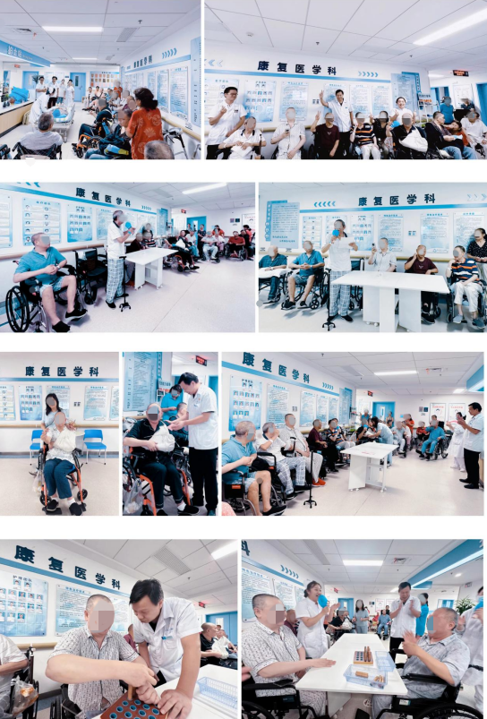 活动一开始,患者代表李爷爷献唱了一首《我爱你,中国》,高亢、激情的歌声瞬间点燃现场气氛;通过抽取幸运纸条,患者们纷纷表演起自己的拿手好戏,越来越多的患者加入进来,欢乐的气氛洋溢在整个科室;游戏环节,在医生的指导下,患者们积极完成手指功能训练;康复知识大讲堂上,护士胡冰星为大家讲解如何有效预防失禁性皮炎,同时演示了偏瘫患者良肢位的正确摆放。