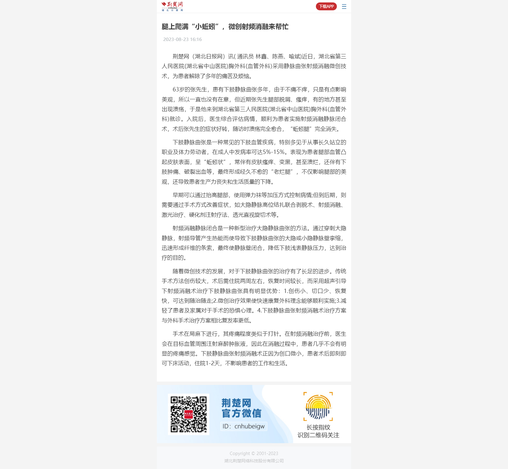 腿上爬满“小蚯蚓”,微创射频消融来帮忙 发布时间:2023-10-17 来源:胸外科(血管外科) 上一篇:旅游途中突发怪病 万里寻医重获健康 下一篇:【中山医“声”】腹泻造成急性肾功能衰竭,罪魁祸首竟然是它