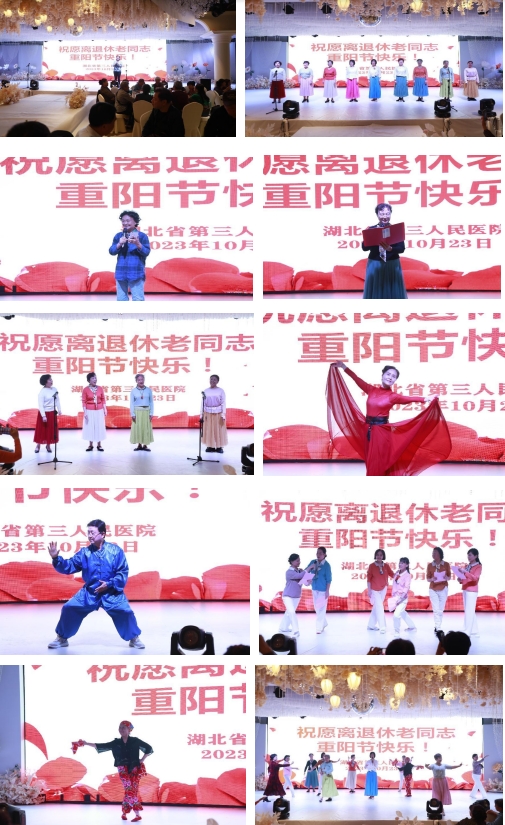 午餐前,纪委书记兼工会主席邓小容同志代表医院向老同志们致以节日的问候和美好祝愿。工会(离退休)办公室积极组织退休文艺积极分子,加班加点自编自导了10个文艺节目。首先是天使之韵合唱团余杰团长、吕宾艺术总监等老师表演的小合唱《花又落》、《山楂树》唱出了满满的幸福感;孔巧、杨旭、冯精洁、张隔芝等老师的女声四重唱《萱草花》唱出了伟大母亲的情怀;81岁高龄彭林曦老师独唱《郊道》,依然歌声豪迈,荡气回肠;在《我和我的祖国》音乐伴随下,潜修太极拳30余年的杨建国调研员将太极拳演绎得炉火纯青;李芳玲老师的舞蹈《我和我的祖国》、《江山》跳出了对祖国、对中国共产党的无比热爱;张隔芝老师的舞蹈《泪蛋蛋掉进水杯杯里》,跳出了对勤劳的陕北人民的深情厚爱;程桂春老师深情并茂的朗诵《我想把秋天寄给你》,王小萍、季红、李志英等老师朗诵的《老有老的骄傲》表现出莫道桑榆晚,为霞尚满天的精神风貌;张元萍独唱《幸福中国一起走》大气磅礴。丰富多彩的文艺节目,赢得了现场观众热烈的掌声和欢呼声,把整场活动推向高潮。