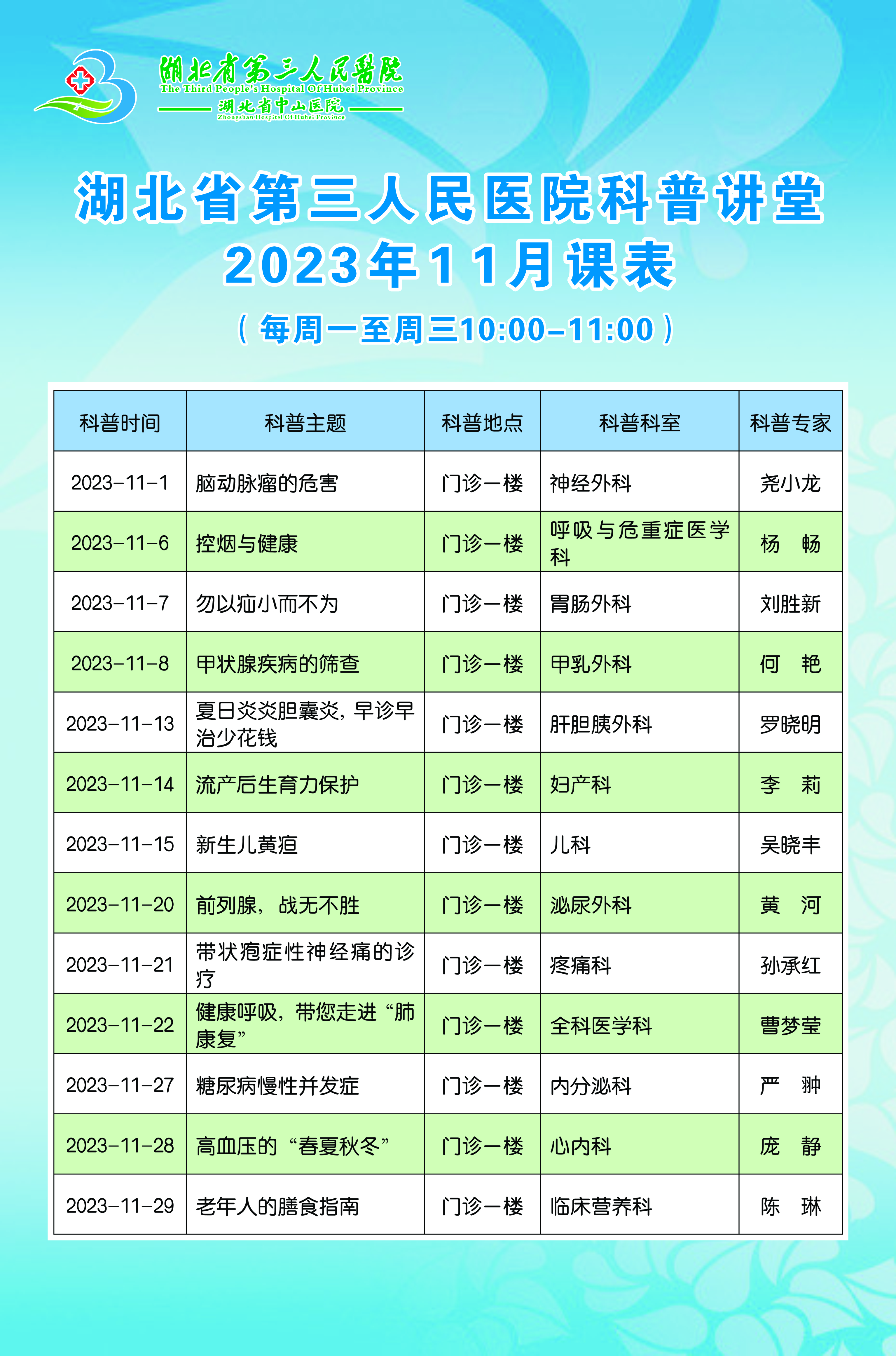 脑动脉瘤有哪些危害?带状疱疹性神经痛怎么治疗?高血压到了冬季有哪些变化?来自神经外科、妇产科、甲乳外科、疼痛科、心内科、泌尿外科等科室的科普话题,将为您带来系列健康盛宴。