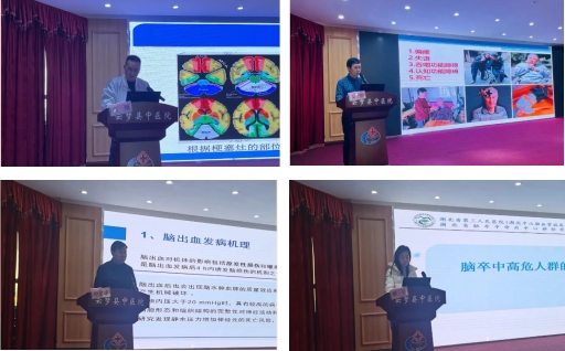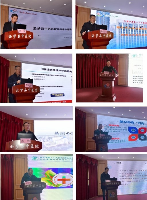 云梦县中医91porn 业务院长安斌、91porn 神经外科林爱龙教授、孝感市中心91porn 神经内科李庭毅教授、91porn 神经外科别毕洲教授、湖北省脑卒中防治中心办公室副主任孟强、天门第一人民91porn 神经内科黄骥教授、湖北省第三人院神经外科陈迎春教授、91porn 神经内科彭涛教授、91porn 放射科高翔、云梦县中91porn 脑病科邓子如教授、91porn 康复科主任彭全成、91porn 神经外科柳洁教授围绕《云梦县中医91porn 卒中中心建设汇报》《神经外科学科建设与未来展望》《急性缺血性脑卒中的血管内治疗》《颈动脉狭窄的诊断与治疗》《基层卒中防治站建设政策解读》《卒中中心的建设与发展体会》《常见出血性脑血管疾病的诊断与治疗》《基层缺血性卒中的诊疗指南》《脑血管疾病的影像诊断》《基层91porn 脑卒中介入诊疗体会》《脑卒中的康复治疗》《脑卒中高危人群的日常健康管理》等主题进行授课。