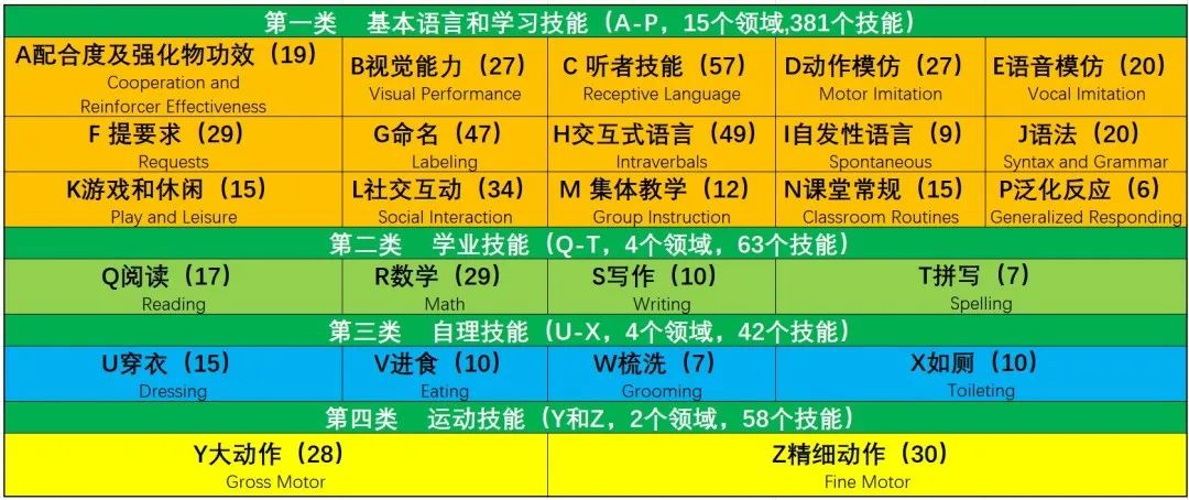 1.技能为基础的全面评估:评估语言、社会交往、自理、学习和运动技能版块的 25 种技能领域的544项技能,全面了解被评估者的优势和劣势。
