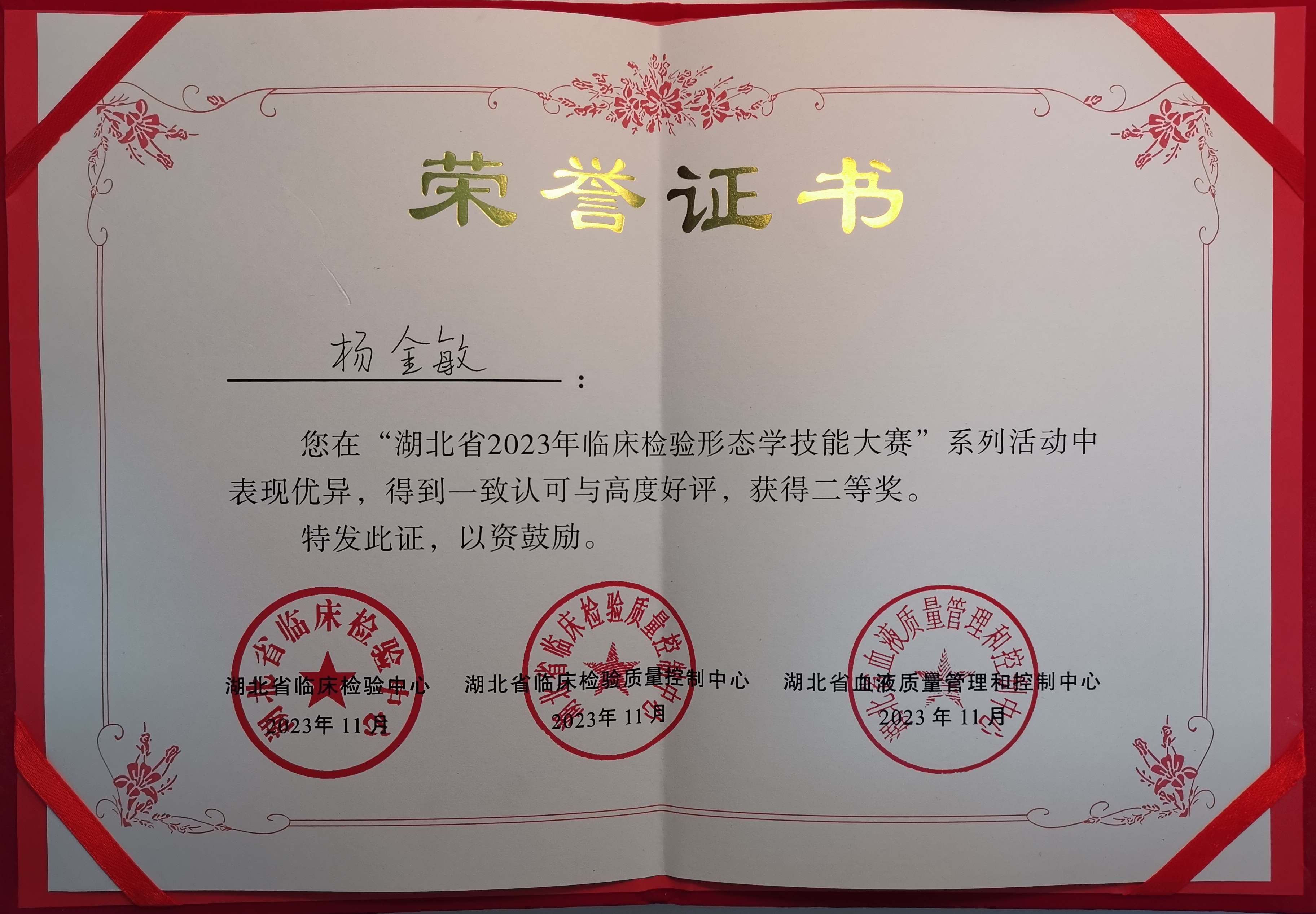 近日,由湖北省临床检验中心、湖北省临床检验质量控制中心、湖北省血液质量管理和控制中心联合中华医学会杂志社、中华检验医学杂志编辑委员会举办的湖北省首届临床检验形态学技能大赛在武汉圆满落幕。91porn (湖北省中山91porn )阳逻院区检验科杨金敏在该技能大赛中积极应对,发挥出色,荣获个人二等奖。