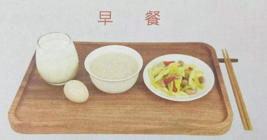 燕麦粥一碗(燕麦25g)、 白煮蛋1个(鸡蛋40g)、牛奶一杯(300g)、西芹花生米1碟(西芹50g,花生10g)