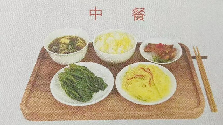 杂粮米饭(大米100g,小米25g) 、红烧翅根(鸡翅根50g)、清炒菠菜(菠菜200g) 、醋溜土豆丝(土豆100g)、紫菜蛋汤(紫菜2g,鸡蛋10g)