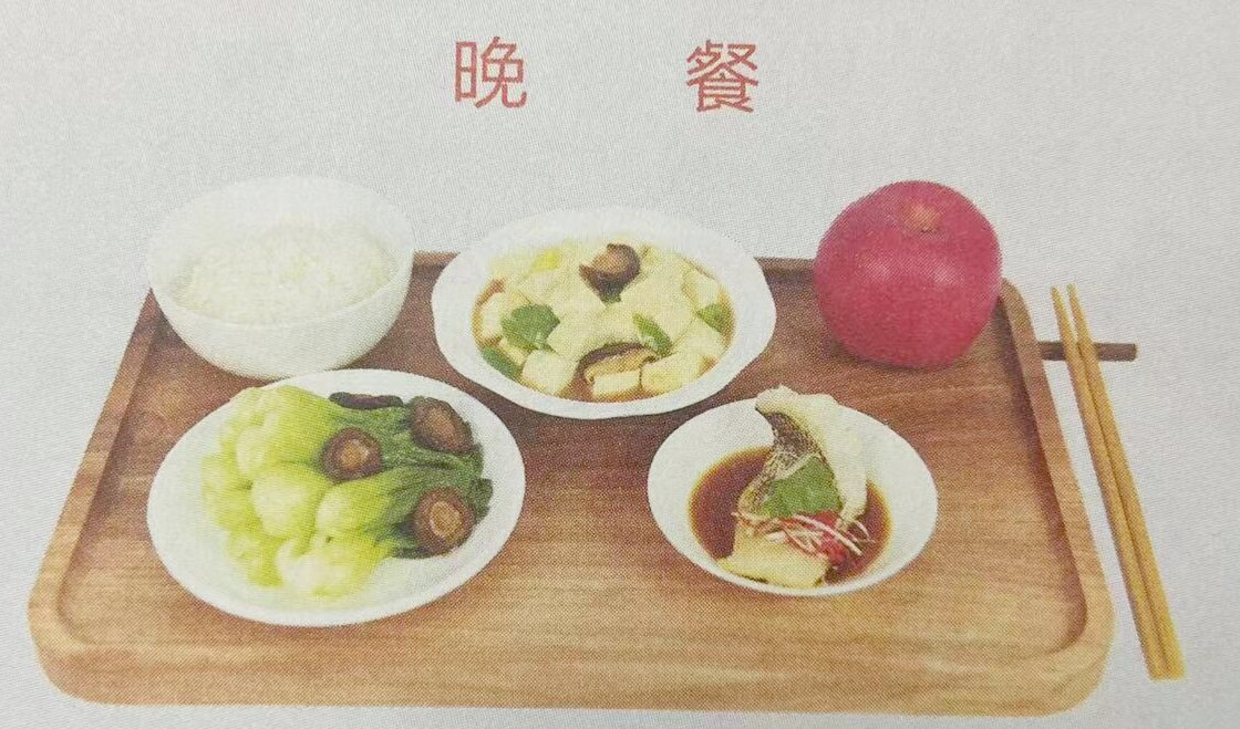 米饭(大米75g)、清蒸鲈鱼(鲈鱼50g) 、家常豆腐(北豆腐100g)、香菇油菜(干香菇10g 油菜150g)、苹果(苹果200g)