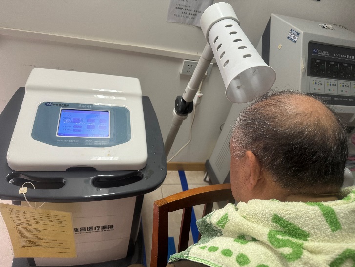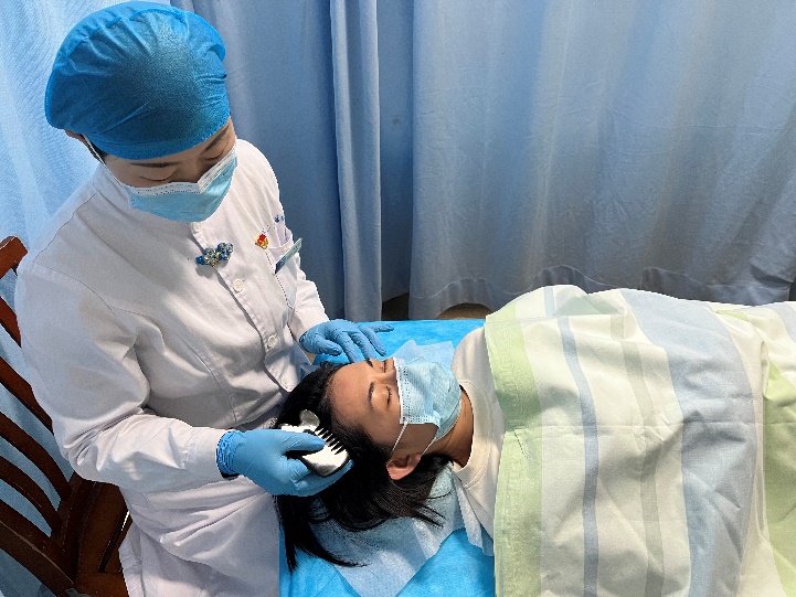 通过手法按摩及头部刮痧刺激头部穴位如百会穴、印堂穴、神庭穴、太阳穴、安眠穴等,达到调畅气机、通达气血、镇静安神的作用。