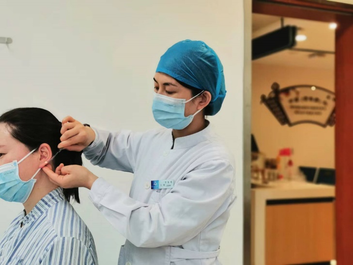用王不留行子贴压刺激耳廓穴位的方法。“耳者,宗脉之所聚也”。通过刺激耳部相应穴位,通经活络、调节阴阳,从而达到治疗失眠的作用。选穴:皮质下、心、脾、额、神门、垂前、内分泌等。