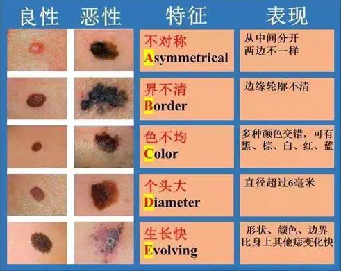 痣的外形通常会释放一些“信号”。我们可以通过观察痣的外形来进行初步的“自我评估”。黑色素瘤与普通色素痣的鉴别要点可遵循ABCDE法则,具体如下: