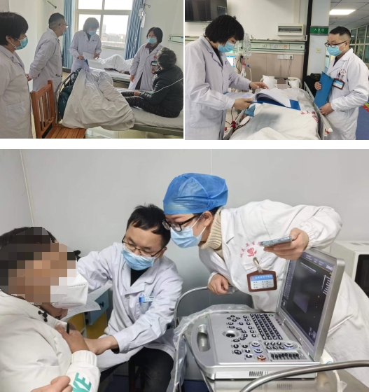 在病房里,龙利对疑难危重病人进行了查房指导;徐敏、刘浩两位医生对血液净化中心尿毒症患者的血管通路做了彩超检查,针对疑难通路,做了详细的血管标记,给出了下一步处理建议;护士长王玮针对如何提高血液净化中心护理水平给出合理建议。