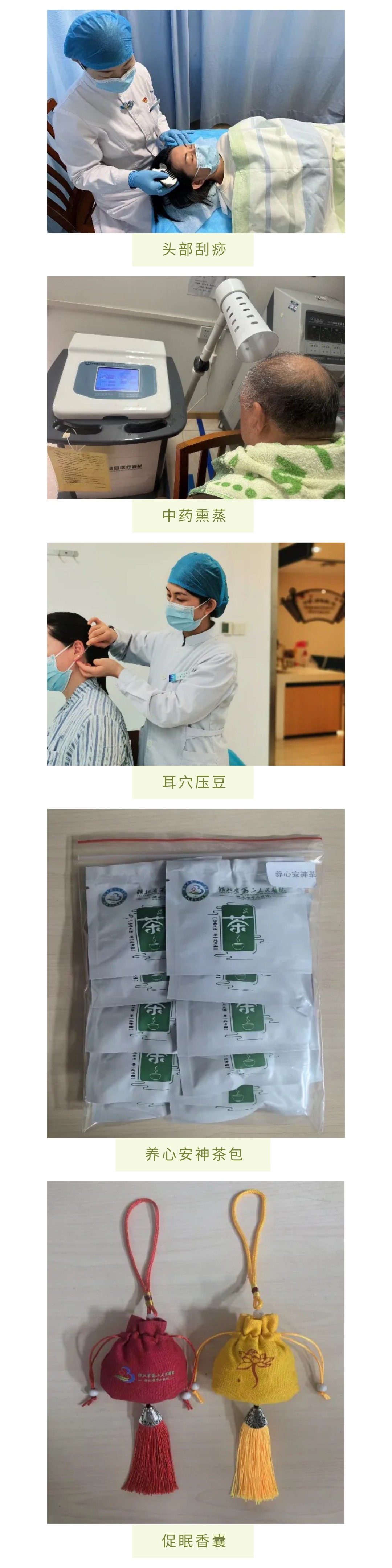 失眠患者通常还伴有很多其它症状,比如耳鸣、心悸、头昏、头痛、口干、口苦、便秘或排便稀溏、腹胀、盗汗等,因此在治疗方法上不能只采用单一的治疗方法,中医科失眠专病门诊目前已开展多项中医适宜技术外治法,包括针刺、艾灸、头疗、头部刮痧、中药熏蒸、耳穴压豆、中药足浴等配合中药煎剂内服,为长期顽固性失眠患者顺利解决睡眠问题。