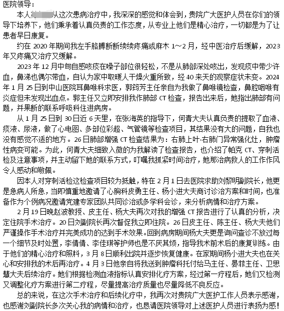 用心治疗,用情护理,肺癌患者写下千字感谢信送医护