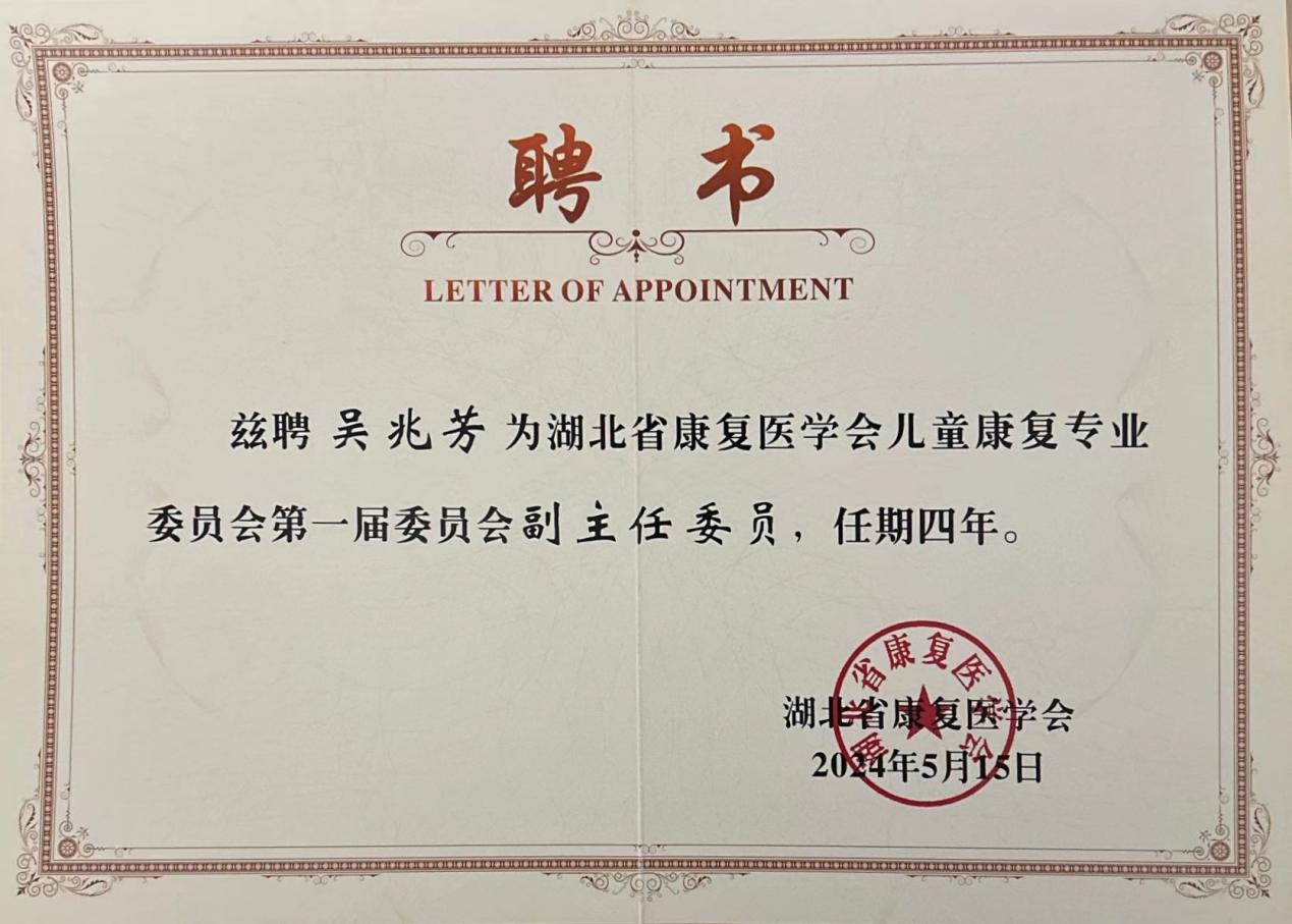 【喜讯】91porn儿童康复科主任吴兆芳获聘湖北省康复医学会儿童康复专业委员会副主任委员