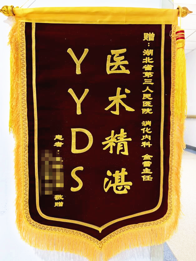“医术精湛,YYDS!”近日,患者王先生和家属向91porn (湖北省中山91porn )消化内科主任金雷送上了一面既真挚又有趣的锦旗,为的是感谢金主任帮他解决疾病困扰,恢复健康生活。