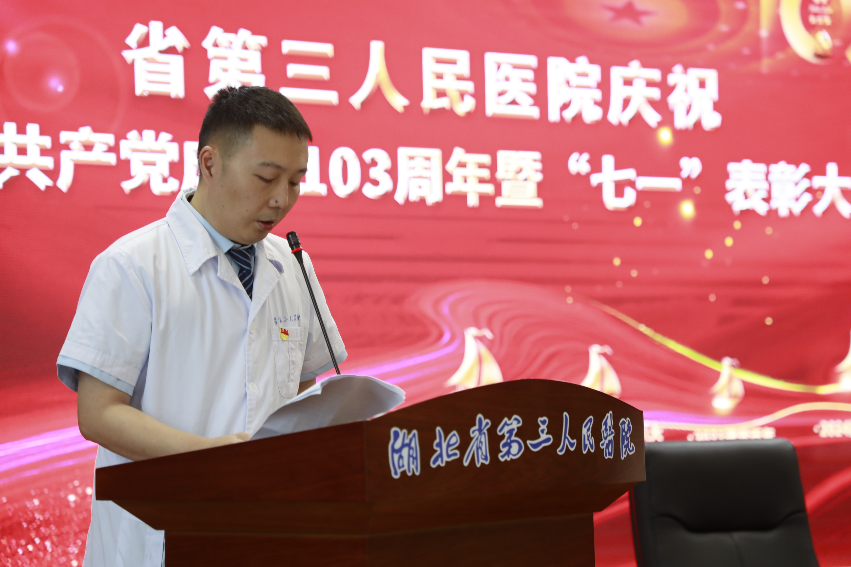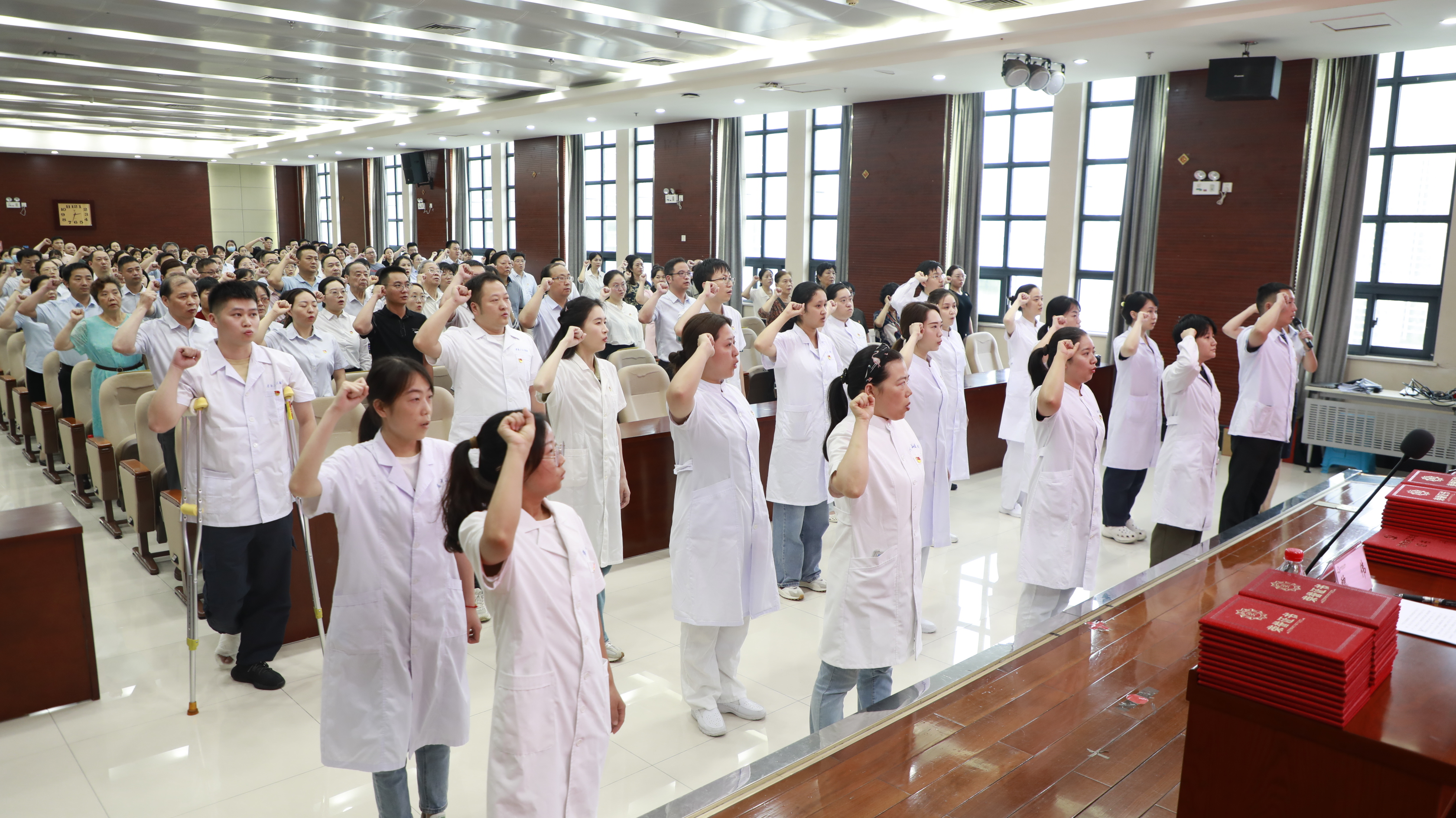 中医科(中医老年病科)主任胡东辉代表新党员作表态发言。他表示,将不忘初心、牢记使命,忠诚践行党旗下的铮铮誓言,始终秉承“大医精诚”之古训,以患者为中心,用实际行动诠释“共产党员”这四个字的深刻含义,做信仰坚定的“带头人”、政治清醒的“明白人”、 遵纪守法的“模范人”、廉洁奉公的“干净人”、敬岗爱业的“担当人”。