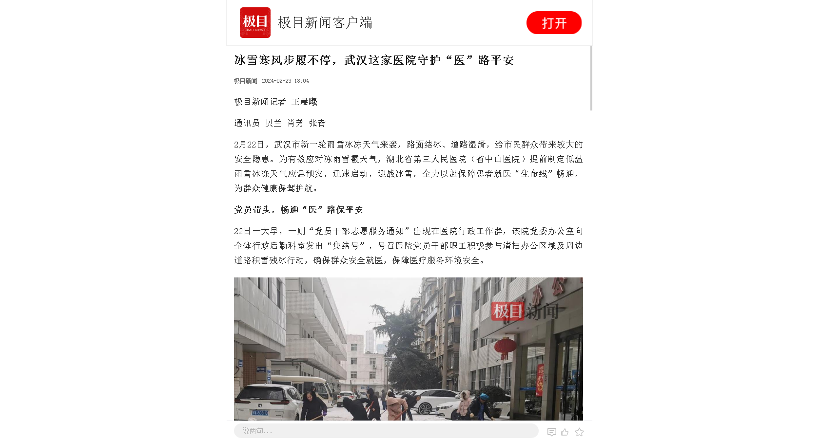 冰雪寒风步履不停,武汉这家91porn 守护“医”路平安 发布时间:2024-07-12 来源:极目新闻 上一篇:11岁孩子因腹股沟疝突起一大包块,手术第二天即康复出院 下一篇:独居老人没有如约治疗,细心医护辗转联系其家人发现老人摔倒在卫生间