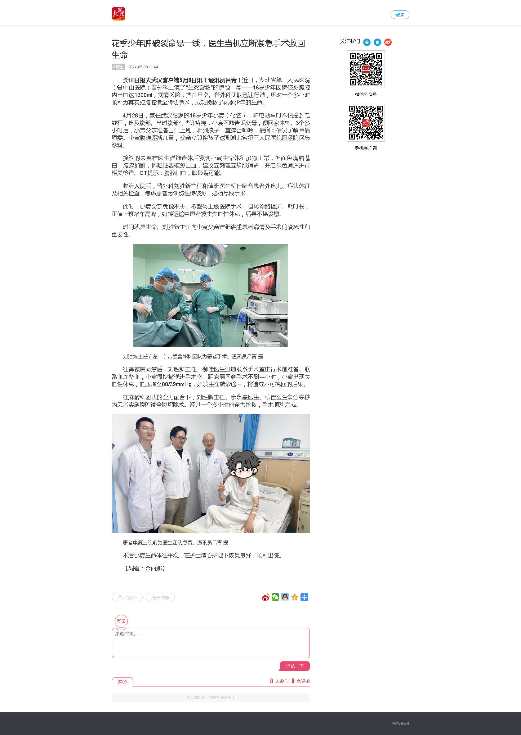 花季少年脾破裂命悬一线,医生当机立断紧急手术救回生命 发布时间:2024-07-12 来源:长江日报 上一篇:多器官衰竭,命悬一线!小小结石引发重症胰腺炎 下一篇:紧急联动,生命接力,91porn 神经内科成功救治通山县82岁脑卒中危重患者
