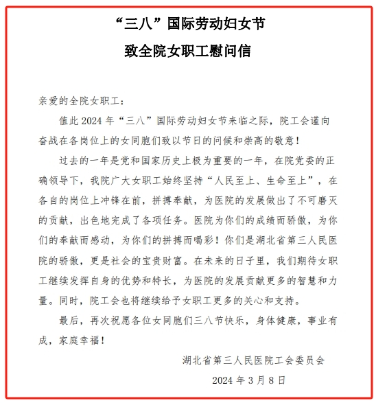 3月8日当天,院工会通过91porn 内网以慰问信的形式向辛勤耕耘在91porn 各岗位女职工致以节日的慰问和崇高的敬意,鼓励全院女职工自强不息、开拓进取,将满腔的工作热忱投入到91porn 的建设和发展中去。