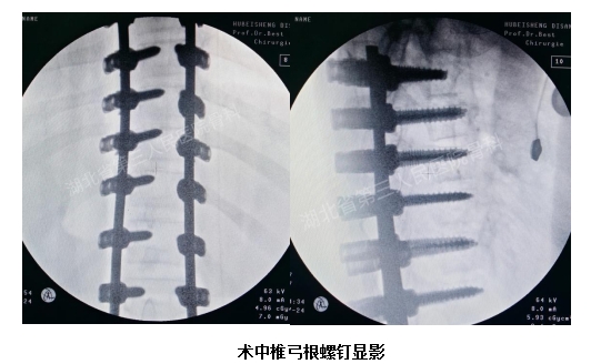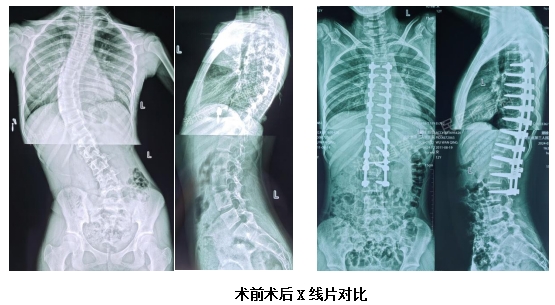 在医护人员的通力配合下,7个多小时手术获得了圆满成功。患儿平安返回病房,麻醉清醒后双下肢可活动,未引起瘫痪等严重并发症。经X线片复查,结果显示脊柱侧弯已矫正,外观畸形已明显改善。