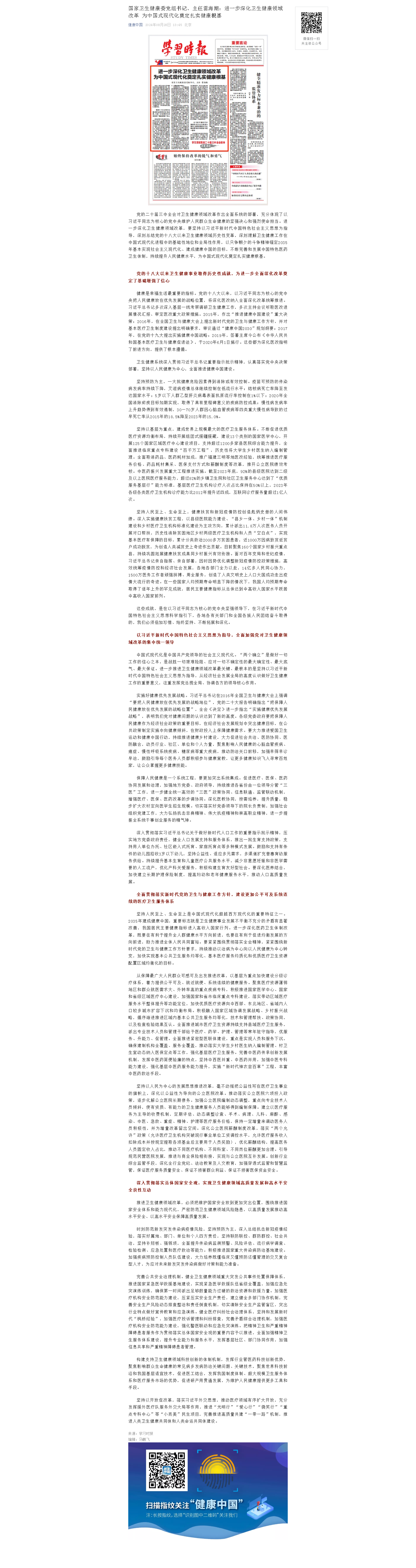 国家卫生健康委党组书记、主任雷海潮:进一步深化卫生健康领域改革 为中国式现代化奠定扎实健康根基 发布时间:2024-09-03 来源:健康中国 上一篇:减法月饼真的“减”了么 下一篇:国家卫生健康委党组传达学习贯彻党的二十届三中全会精神