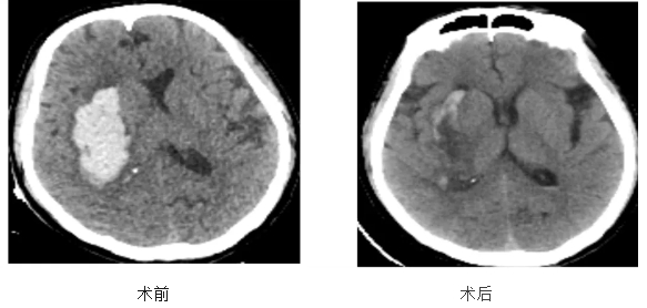 术后第一天患者意识清楚。复查头颅CT可见右侧基底节区脑内血肿已完全清除,脑组织及脑室受压解除,中线结构居中,颅骨缺损直径约1cm。经过两周的专业治疗,患者于9月2日顺利康复出院。