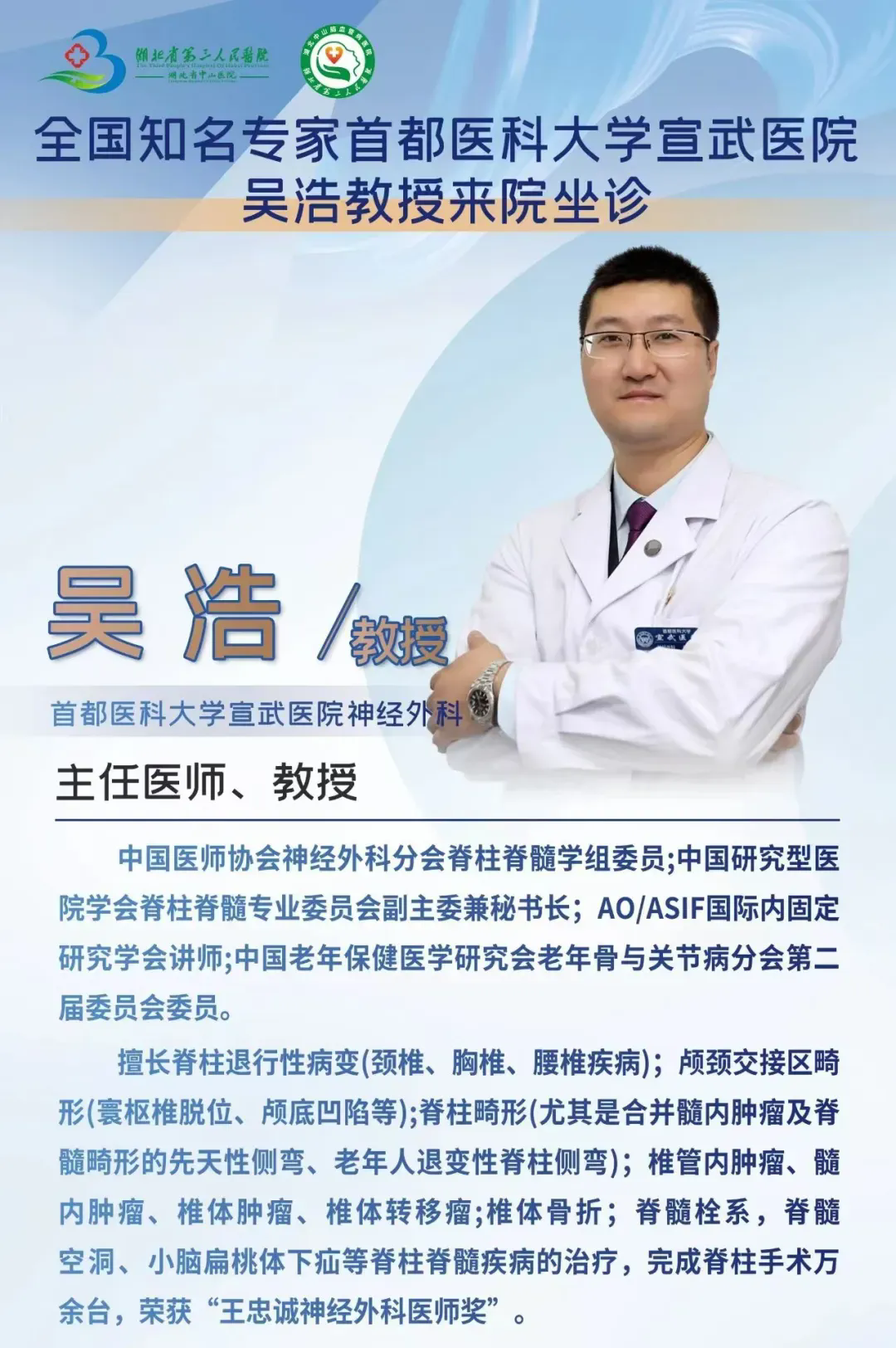 名医来啦!10月19日,首都医科大学宣武91porn 吴浩教授来院坐诊!