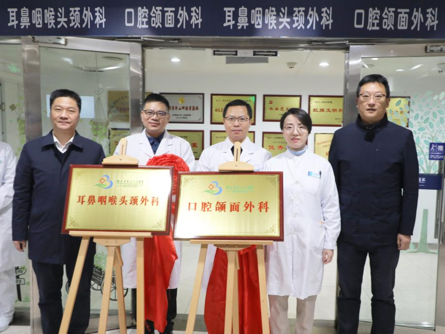 揭牌仪式在博爱楼7楼举行。党委书记朱海东、副院长刘黎明,口腔科主任王瑾、副主任倪小兵以及耳鼻咽喉科主任张志敏共同为口腔颌面外科、耳鼻咽喉头颈外科揭牌。