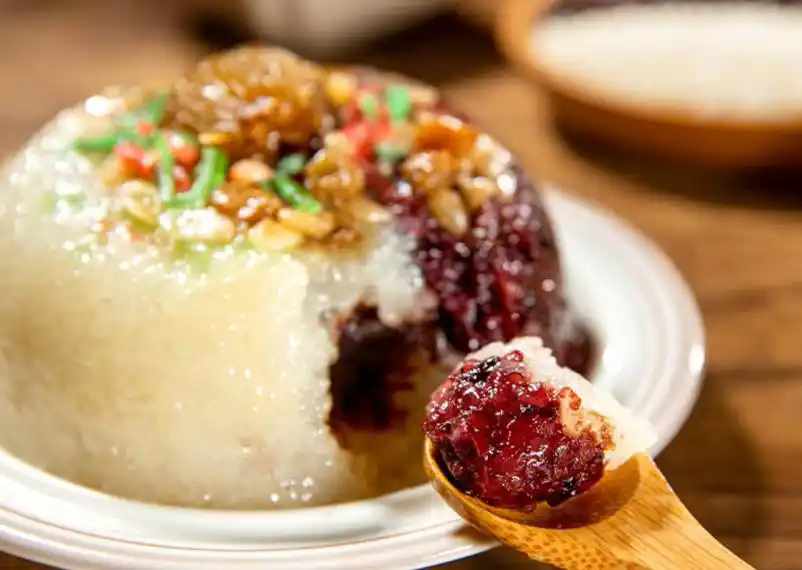 【做法】将赤小豆、薏米、莲子用清水洗净,浸泡2小时,再加入糯米、大米、枸杞子、桂圆肉、大枣等,用旺火蒸熟,加白糖适量食用。