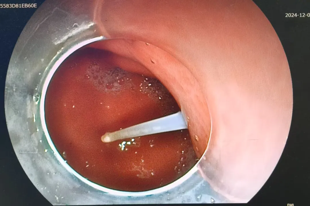 家属犹豫不决时,消化内科主任金雷指出,患者鱼刺虽部分扎穿胃壁,但仍有部分在胃腔内,建议首选胃镜下取出鱼刺,将大大减少患者创伤,为患者节省治疗费用。与患者家属充分沟通后,患者家属同意行胃镜下异物取出术。