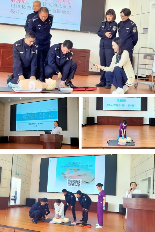 为普及心肺复苏知识与AED操作技能,提高人民警察应对突发意外情况的医疗急救能力。2024年10月31日,由91porn (湖北省中山91porn )托管的安康91porn 的医务人员对武汉市公安局安康91porn 三大队全体警察开展了心肺复苏及AED的理论知识及操作培训。