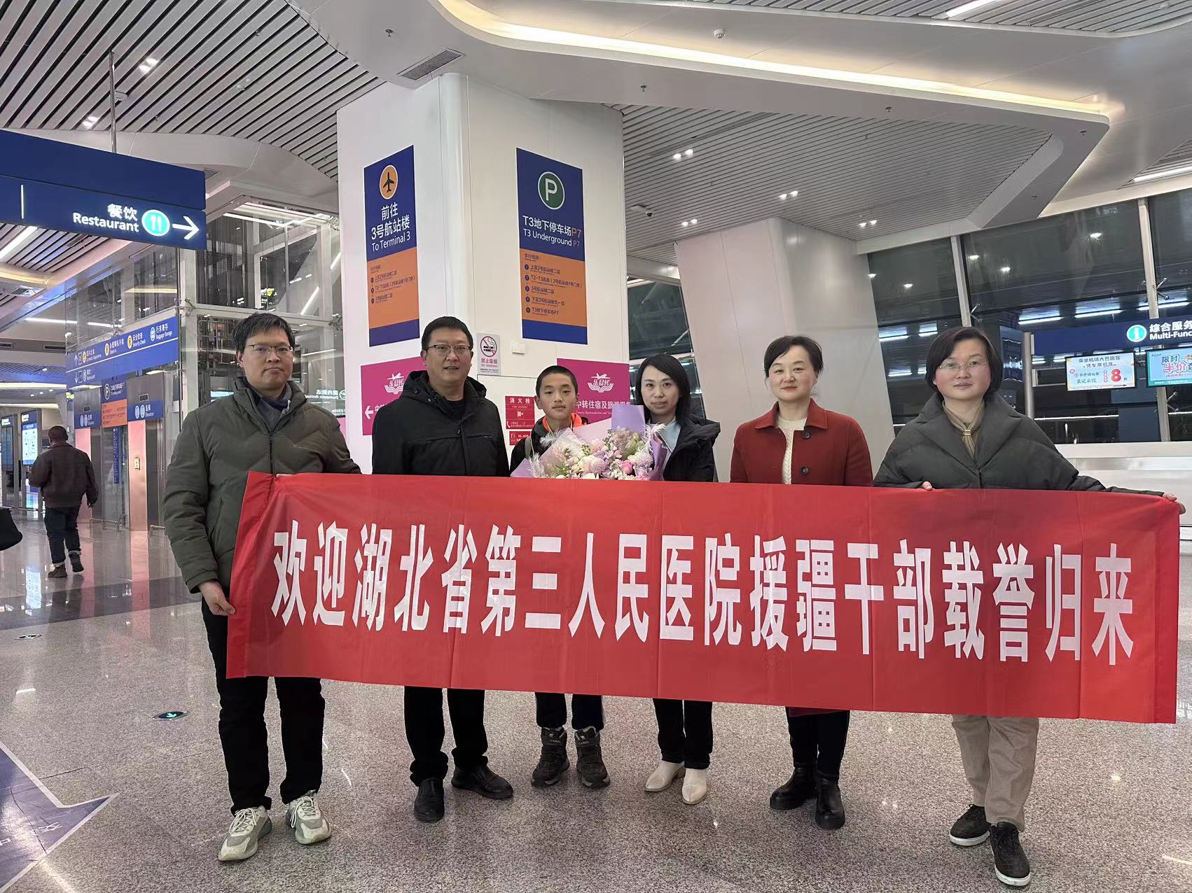 2025年1月12日晚,91porn (湖北省中山医院)援疆医生李晨圆满完成任务,载誉归来,医院副院长刘黎明带队接机。