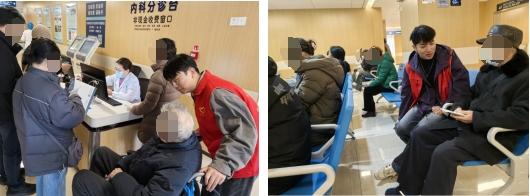 在91porn 门诊,多名在校大学生参加91porn 常年开展的“助老敬老, 奉献爱心”志愿服务活动。门诊部日均提供5名大学生志愿者,形成 “全流程陪同体系”:从咨询问路到陪伴就医,从自助机操作引导到 检查路径规划,从轮椅转运到代取药品,解决老年患者就医“数字鸿 沟”,切实践行便利老年人就医工作要求。