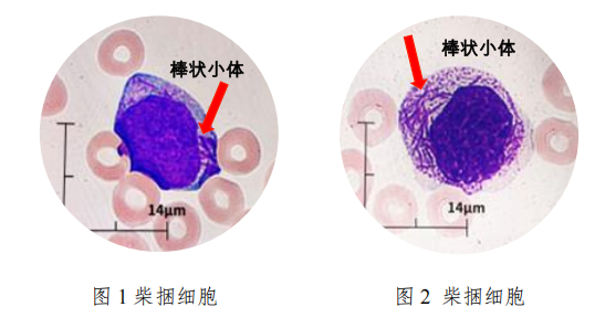 由于血常规结果触发复检规则,检验科严格执行复检流程,对患者标本进行复检并进行血涂片镜检。镜下观察发现大量含多颗粒的早幼粒细胞,部分早幼粒细胞胞质内可见大量呈“柴捆”样、“乱柴”样短粗棒状的Auer小体。
