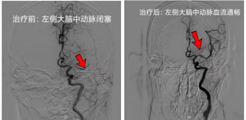 另一边,神经内科副主任彭涛、介入组长杨昊为患者行左侧大脑中动脉取栓术及球囊扩张成形术,后复查显示大脑中动脉血流恢复通畅。