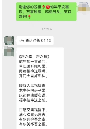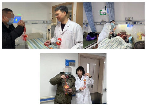 新春佳节,肾病内科(风湿免疫科)暖意浓浓,医患情深。科主任龙利收到了一位透析十多年的患者杨老师写的感谢诗句;科室医护们也在龙利,副主任金晟、张继波,护士长李湛、王玮的带领下来到病区将新年的祝福送到每位患者手里。