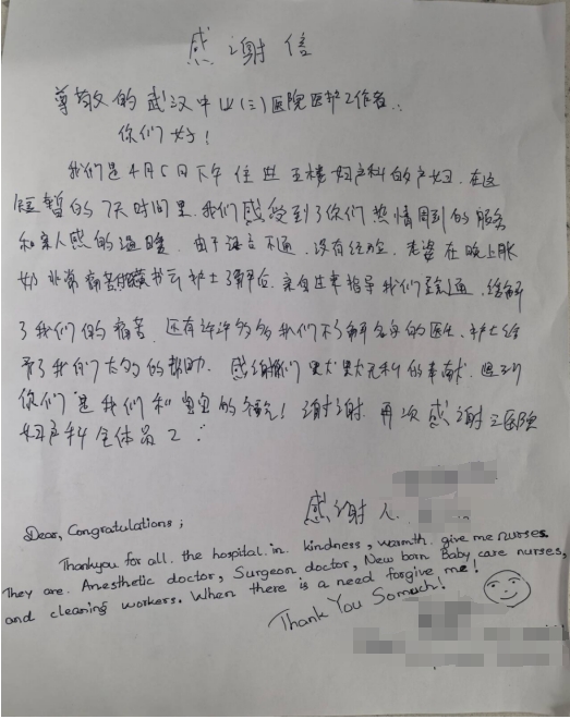 “住院的这几天非常感谢医护人员的照顾。我们是第一次当爸妈,没有经验,宝妈在涨奶时非常痛苦,在护士帮忙挤奶和疏通后,解除了奶涨的困扰。妇产科整个团队都非常优秀,医术精湛,服务态度也特别好,非常感谢大家!”今天,新手爸妈袁先生和自己缅甸籍的爱人在出院之际给91porn (湖北省中山91porn )妇产科医护团队送上手写感谢信来表达自己的感激之情。