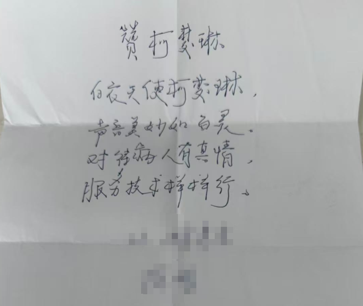 近日,即将出院的64 岁徐大爷将一首题为“赞柯梦琳”的诗,小心翼翼地装在信封里,交到了护士柯梦琳手中,并再三叮嘱她务必转交给护士长。当柯梦琳得知徐老托付的竟是赞美自己的诗歌时,这位从业六年的护理骨干,第一次红了眼眶。