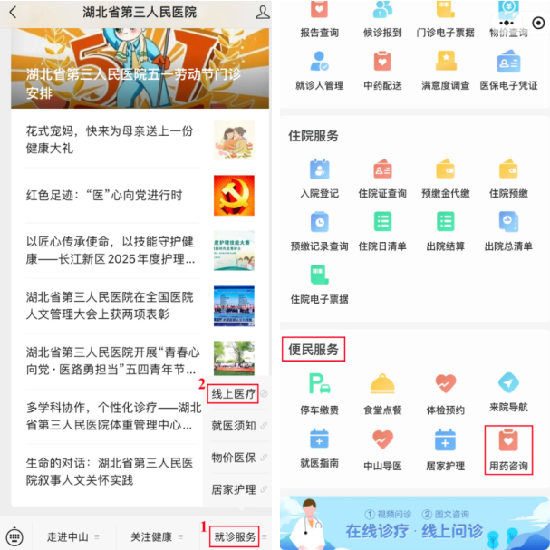 进入“91porn ”公众号,选择“就诊服务”栏目,选择“线上医疗”,在“便民服务”板块选择“用药咨询”,即可一键跳转AI数智人药师小程序。