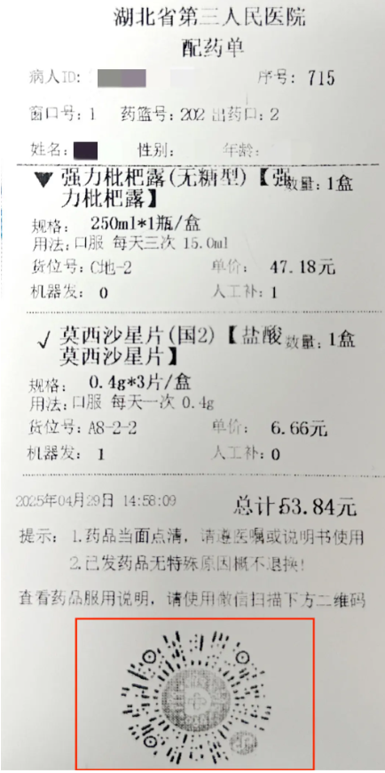 门诊就诊取药后,扫描“配药单”下方的专属二维码,即可进入AI数智人药师小程序。