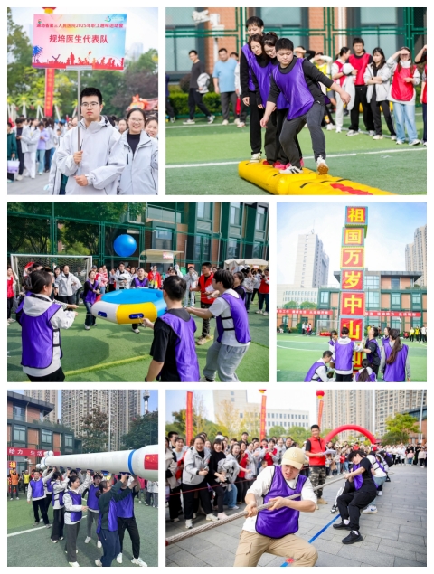 赛场上的他们更是彻底从“住培学员”模式切换为“运动健将”模式,朝气蓬勃,意气风发。在一飞冲天赛场上,他们如离弦之箭,在百米跑道上演绎速度与激情。虽然在试练习的速跑中,有队员摔倒,但是在正式比赛中,他们用坚韧的意志和默契完美的配合赢得了比赛,诠释了永不言弃的医者精神。之后的“八仙过海”、“众心捧月”、“滚滚向前”等比赛笑点频出。学员们暂时放下了平日里的严肃与紧张,通力协作,默契配合,在欢声笑语中极大地增强了团队的归属感和凝聚力。最后的拔河比赛,无疑将运动会的气氛拉升到火爆。学员们心往一处想,劲往一处使,绳子中间的红线每一次移动都牵动着所有人的心。这不仅是力量的角逐,更是团队精神的极致体现。